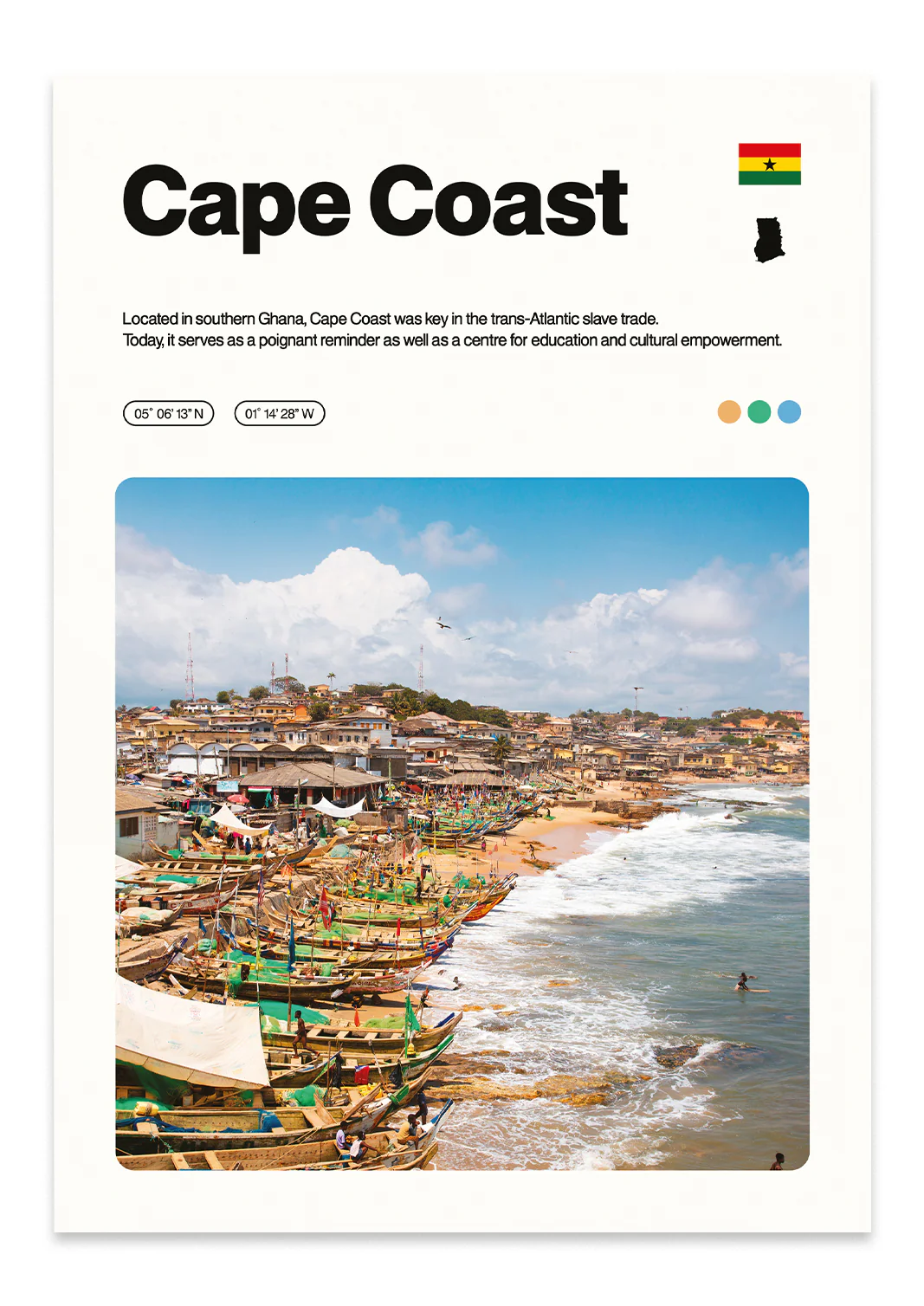 Capture the beauty of Cape Coast in Ghana with this HD print. It features a factfile, GPS coordinates and a complimentary colour palette.