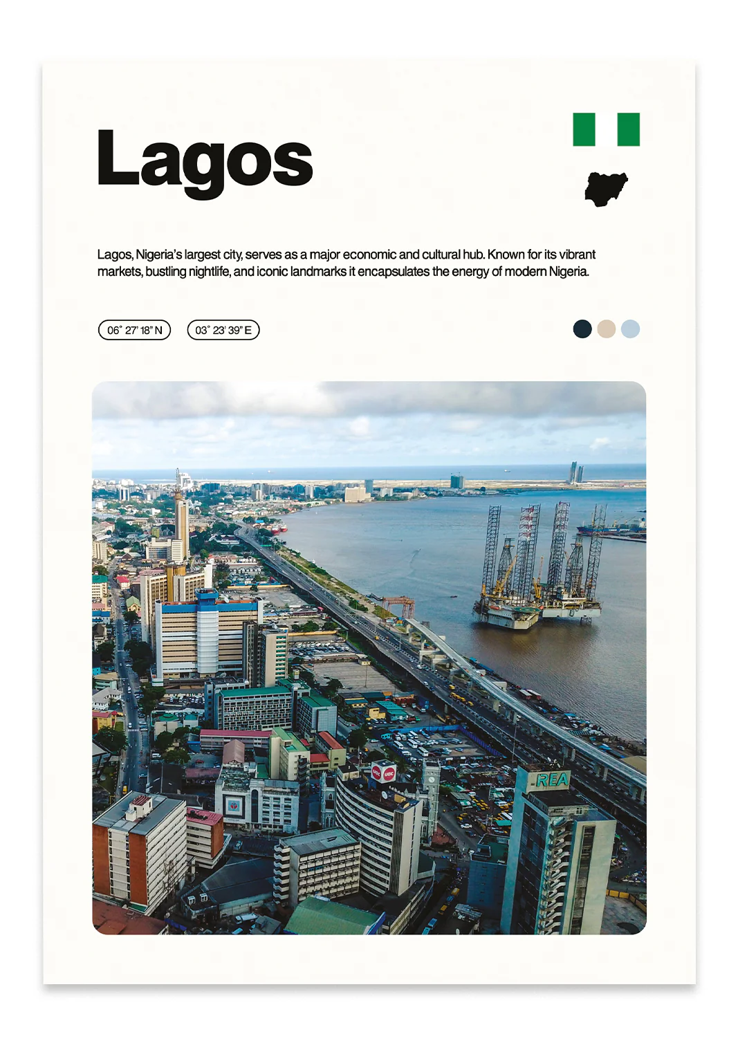 Capture the bustle of Lagos in Nigeria with this HD print. It features a factfile, GPS coordinates and a complimentary colour palette.