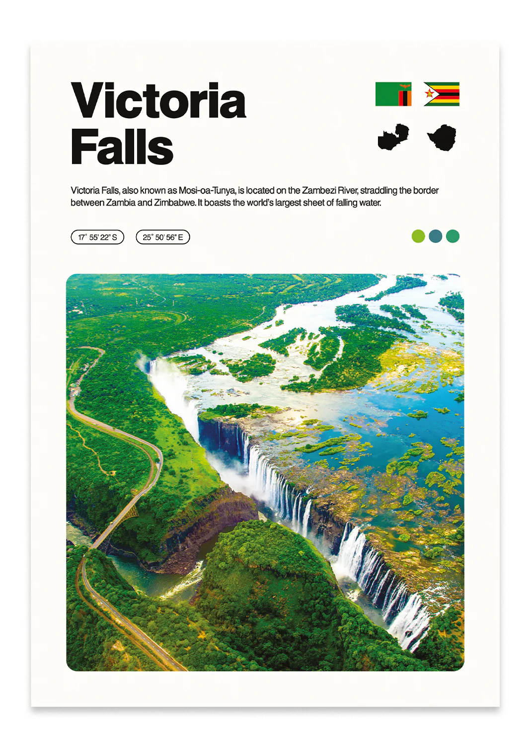 Capture the beauty of Victoria Falls on the Zimbabwe-Zambia border with this HD print. It features a factfile, GPS coordinates and a complimentary colour palette.